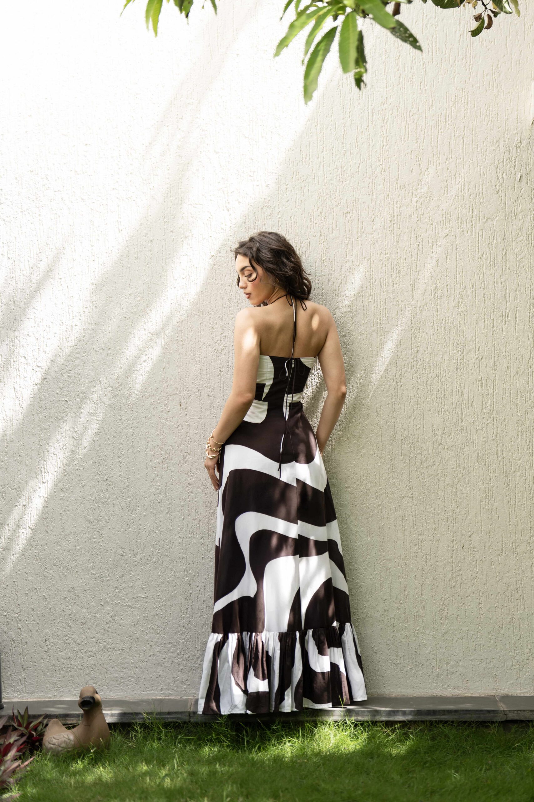 A breezy abstract-print maxi made for sun-soaked days. Designed with tie-up straps that can also be styled as a halter, it features a corset-style bust that flatters while still feeling effortless. The A-line silhouette flows into a flounce hem, adding soft movement with every step. Finished with a right-seam pocket for that casual, easygoing charm – the perfect mix of playful and polished.